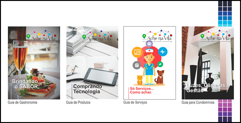 Quatro Revistas temáticas publicadas quadrimestralmente e distribuidas nas áreas de atuação do Guia www.AcheNaVila.com.br